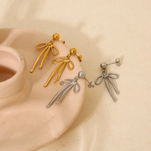 Elevate your style with these 18K Gold Plated Stainless Steel Ribbon Bowknot Drop Earrings. Designed with a graceful bowknot shape, these earrings bring a touch of charm and sophistication to any outfit. Lightweight and versatile, they are perfect for women who appreciate subtle yet impactful accessories. Whether as a gift or a personal indulgence, these trendy dangle studs are a must-have addition to your jewelry collection.