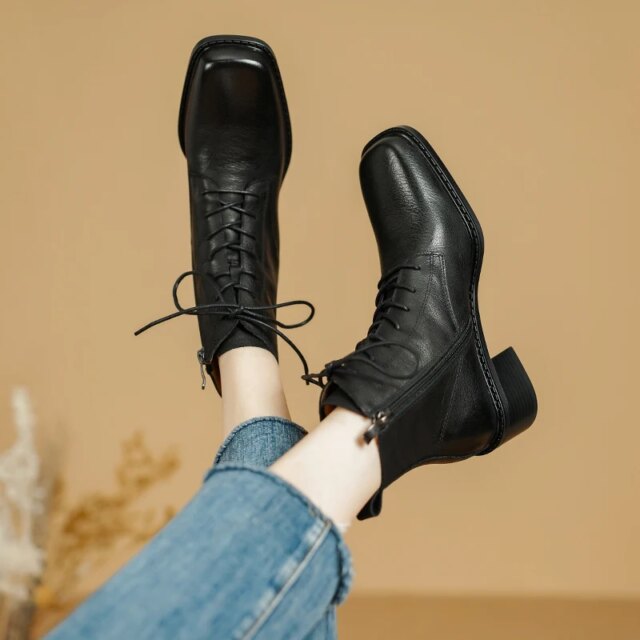 Elevate your winter wardrobe with these stunning Women’s Genuine Leather Ankle Boots. Designed for mature, confident women who value both style and comfort, these boots feature a high square heel and a chic lace-up design. Made from premium cow leather, these ankle boots are the epitome of sophistication and durability. Perfect for the office, casual outings, or evening events, they seamlessly blend practicality with a retro-inspired flair. The short plush lining adds a cozy touch, ensuring your feet stay warm and comfortable throughout the colder months.