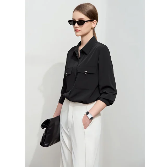 Minimalist Chiffon Work Shirt – Elegant Lapel, Concealed Buttons, Office Chic