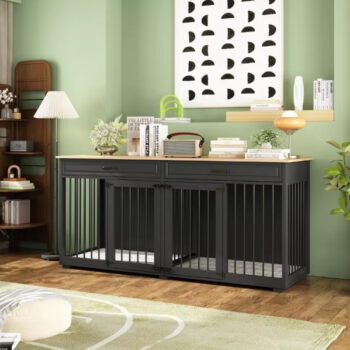 71″ Wooden Dog Crate with Drawers and 3 Rooms – Stylish Dog House Furniture