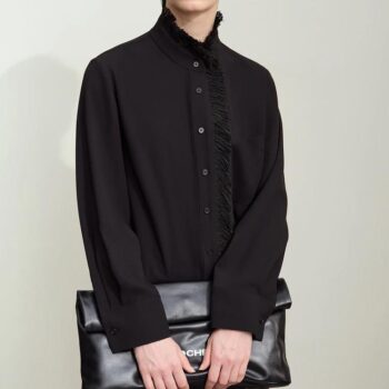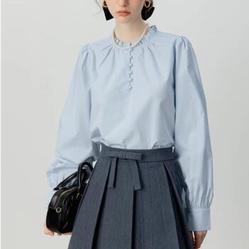Women’s Winter Long Sleeve Blouse with Ruffled Neckline and Puff Sleeves