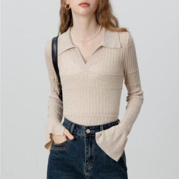 V-Neck Knit Flare Sleeve Slim Fit Long Sleeve Top for Women