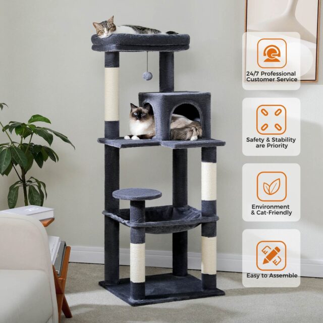This cat tree is not only a play area but also a home for your cat to feel secure and entertained. Its multi-level design offers variety – your cat can choose from multiple cozy spots to rest or scratch. The large hammock is perfect for larger cats, making sure that even the fluffiest of felines have a place to relax. The top perch gives your cat a sense of control, letting them observe their surroundings, while the cozy condo offers a quiet retreat.