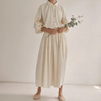 Women’s Cotton Gauze Maxi Dress – Long Sleeve, Lace-Up, Casual Comfort