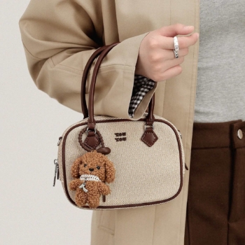 Vintage Brown Bowling Handbag for Women with Cute Dog Pendant & Adjustable Shoulder Strap