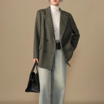 Retro Brown Wool Blend Women’s Blazer with Grid Pattern for Winter