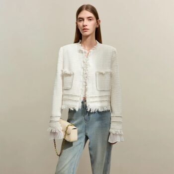 Minimalist Tweed Short Jacket with Tassel Cuffs