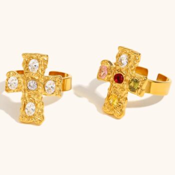 Luxury Sparkling Cubic Zirconia Cross Open Ring – Waterproof Stainless Steel Jewelry