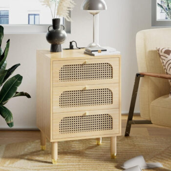 6 Drawer Rattan Dresser with Wooden Frame and Golden Handles for Bedroom