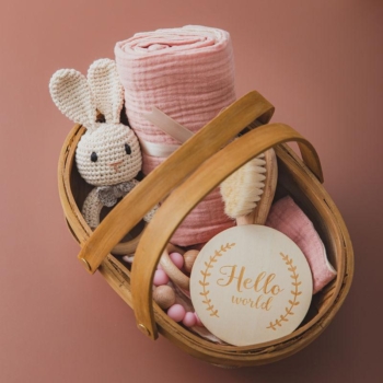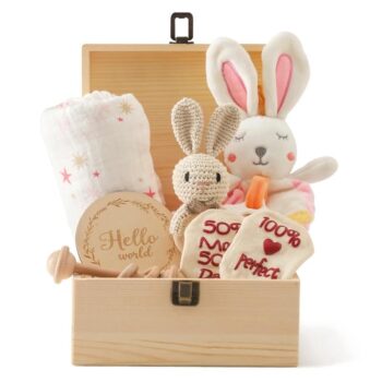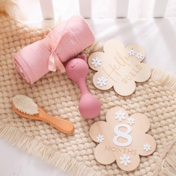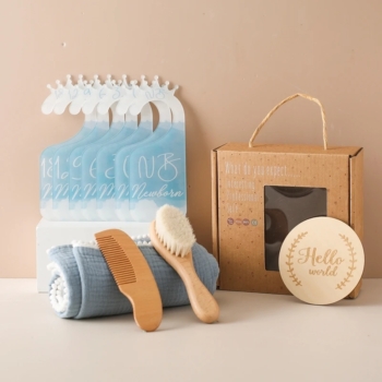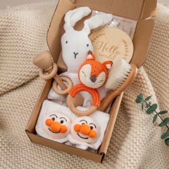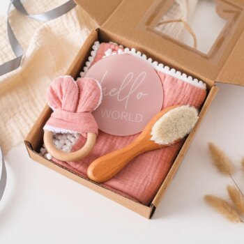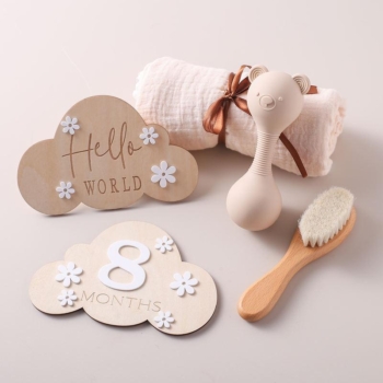 Newborn Baby Bath Gift Set – Cotton Blanket, Wooden Rattle & Milestone Toys