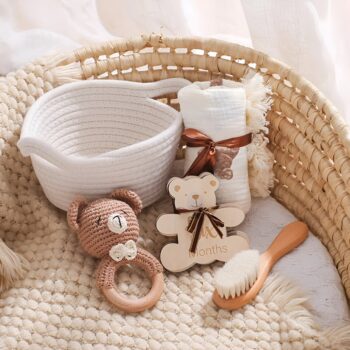 Baby Crochet Bear Wooden Rattle & Sensory Toy Set with Milestone Cards