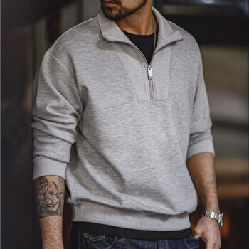 Men’s Casual Gray Pullover Sweatshirt with Patchwork and Standing Collar