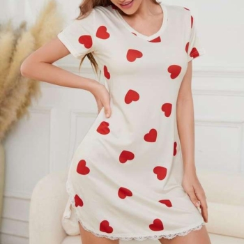Heart Print Lace Hem V-Neck Summer Nightgown with Side Slit and Short Sleeves
