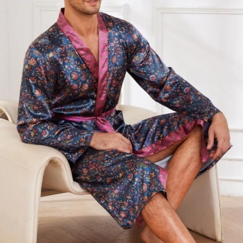 Men’s Satin Kimono Robe with Belt – Navy Blue Print Loungewear