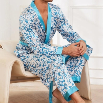 Men’s Satin 2-Piece Pajama Set – Long Sleeve Kimono Robe & Trousers