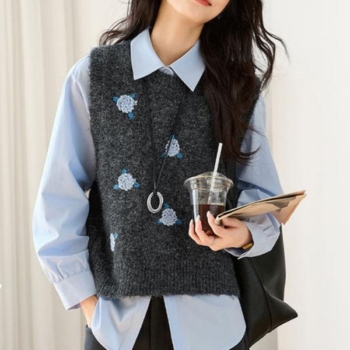 Women’s Embroidered O-Neck Knit Sweater Vest – Loose & Chic Office Style