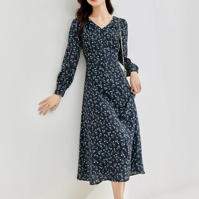 Made from high-quality polyester with a slight stretch, this dress offers a lightweight, breathable feel while maintaining its elegant structure. The delicate print design adds a touch of charm and refinement, making it a standout piece in your wardrobe. Featuring a feminine V-neckline and long sleeves, it provides both style and warmth, making it ideal for transitional seasons.