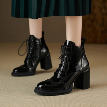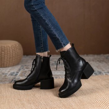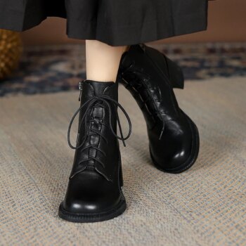 Women’s Genuine Leather Lace-Up Ankle Boots with Thick High Heels