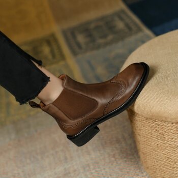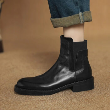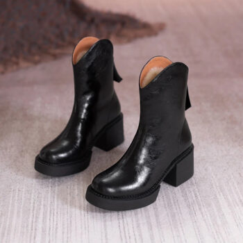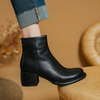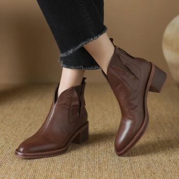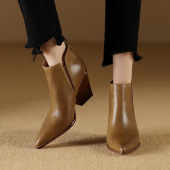 Genuine Leather Pointed Toe Chunky Heel Ankle Boots