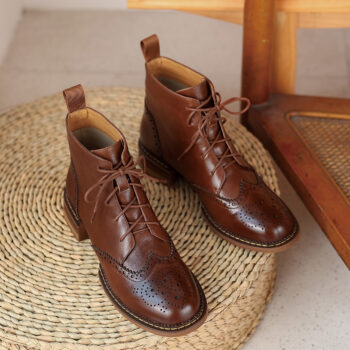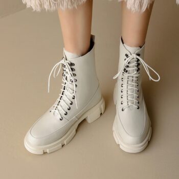 Women’s Genuine Leather Ankle Boots – Lace-Up Round Toe Winter Casual Shoes