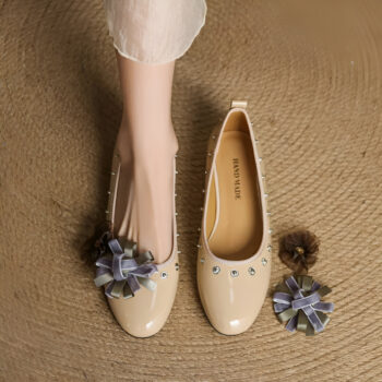 Patent Leather Rivet Flower Loafers for Women with Round Toe and Low Heel