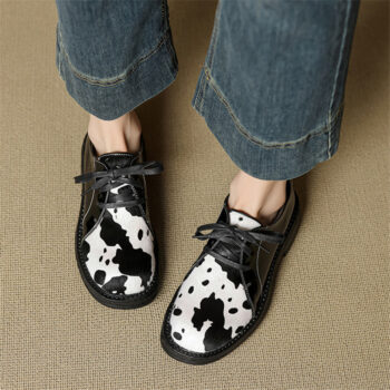 Women’s Black Leopard Print Leather Lace-Up Flats – Casual Round Toe Sneakers