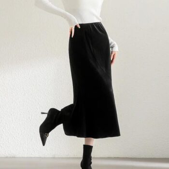 Black Knit High-Waist Midi Skirt with Irregular Split for Women