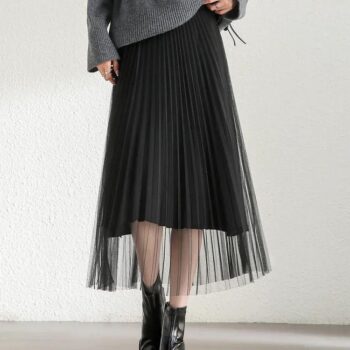 Winter High Waist A-Line Pleated Long Skirt with Mesh Patchwork