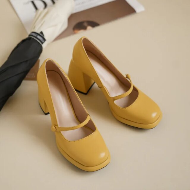 Unlike ordinary heels, these pumps combine a nostalgic Mary Jane design with modern craftsmanship. The genuine leather upper, super high yet balanced chunky heel, and plush latex insole create the perfect harmony of comfort, durability, and charm. The playful color choices make it easy to express your style, whether you prefer timeless black, soft pink, or bold yellow.