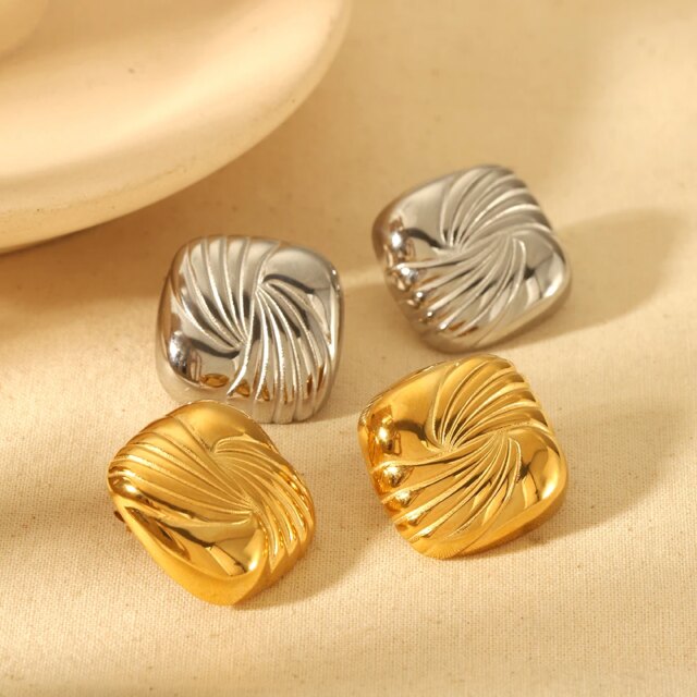 Make a statement with these 18K Gold Plated Stainless Steel Swirl Texture Square Stud Earrings. Designed for women who embrace contemporary trends, these earrings combine sleek geometry with a sophisticated swirl texture. Perfect for any occasion, they are a versatile addition to your jewelry collection, offering a luxurious yet approachable aesthetic.