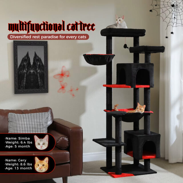 Keep your cat entertained, active, and comfortable with this 69″ tall cat tree! Designed for large indoor cats, this spacious cat tower offers multiple levels of climbing, cozy lounging spots, and sturdy scratching posts to satisfy your pet’s instincts. Whether your cat loves to climb, scratch, or relax, this all-in-one cat tree has it all.