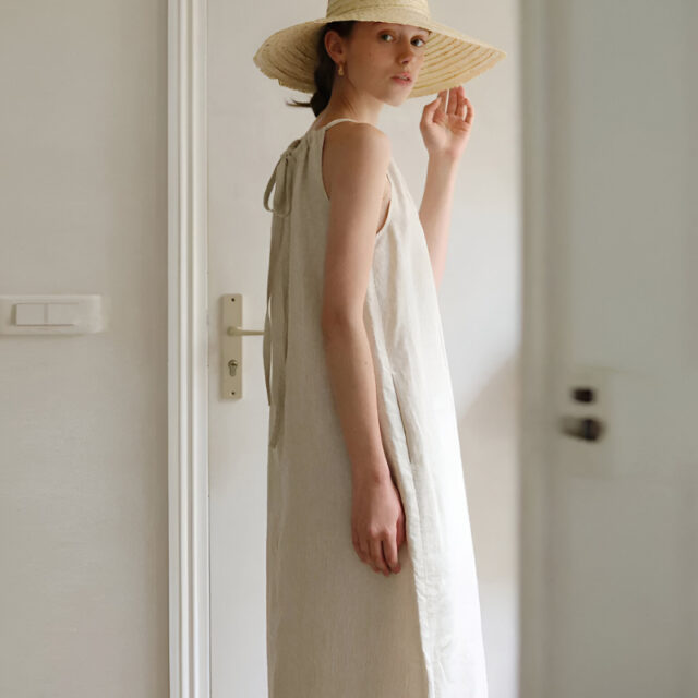 Crafted from premium linen, this piece is lightweight, breathable, and perfect for keeping cool while looking stylish during the warmest months. The halter neck ties delicately at the back, giving it a touch of feminine allure and adjustability. It’s the kind of dress that feels as good as it looks—easygoing yet elevated.
