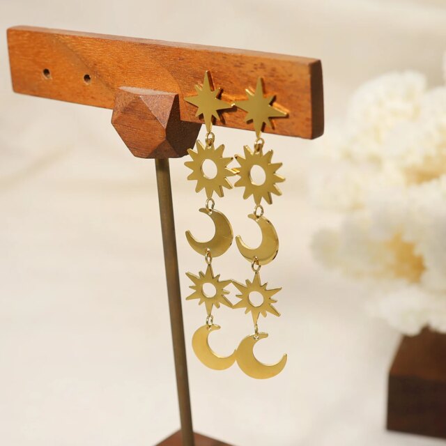 Enhance your style effortlessly with these Star and Moon Drop Earrings. Whether you pair them with a cocktail dress or a casual outfit, they are sure to turn heads and spark compliments. Embrace their unique charm and let them shine as the star piece of your accessory collection.