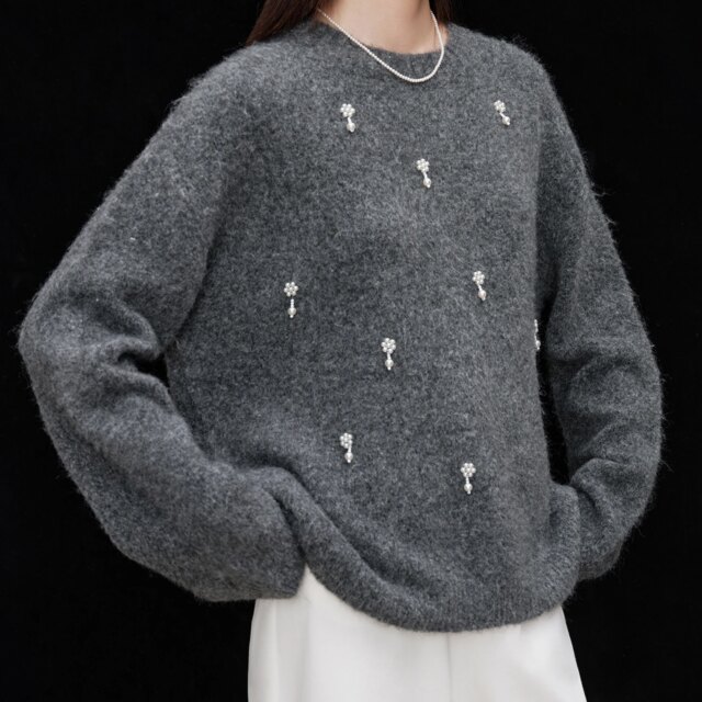 This sweater stands out for its combination of style and versatility. The solid gray color is timeless and pairs effortlessly with jeans, skirts, or trousers, making it a go-to piece for your autumn and winter wardrobe. The decorative beading adds a subtle flair, while the high-quality material blend ensures both warmth and breathability.